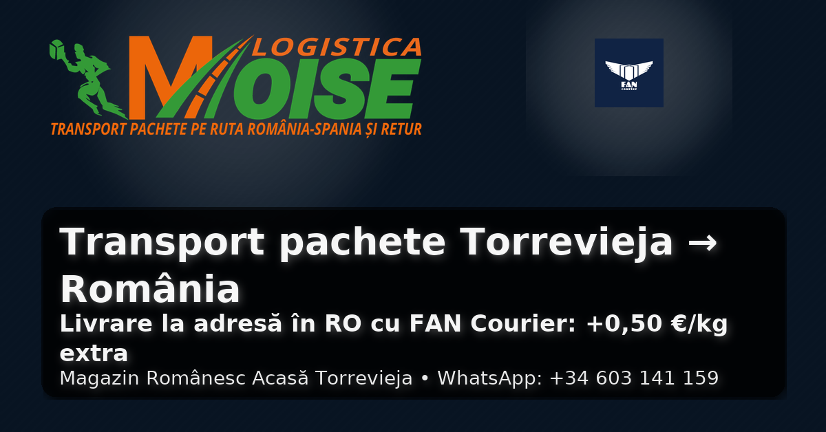 Oferim transport de pachete din Torrevieja către România, cu opțiunea ca acestea să fie livrate direct la adresa destinatarului prin FAN Courier, pentru un cost suplimentar de +0,50 €/kg.